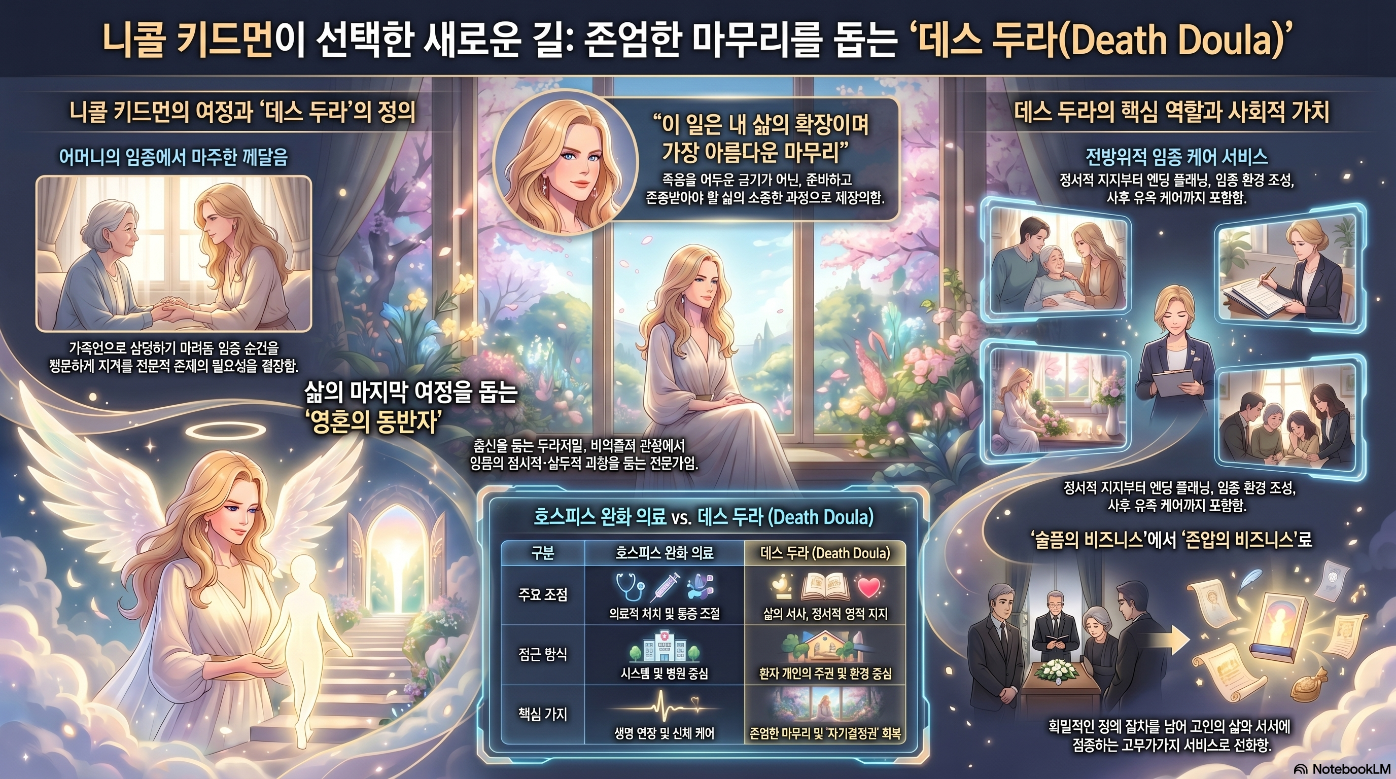 이러한 무력감은 비단 스타뿐만 아니라 우리 모두의 보편적 공포입니다. 키드먼은 의료적 처치만으로는 채워지지 않는 '전문적인 정서적 동반자'의 부재를 절감했고, 이는 그녀를 삶의 마무리를 돕는 전문가의 길로 이끄는 결정적 계기가 되었습니다.