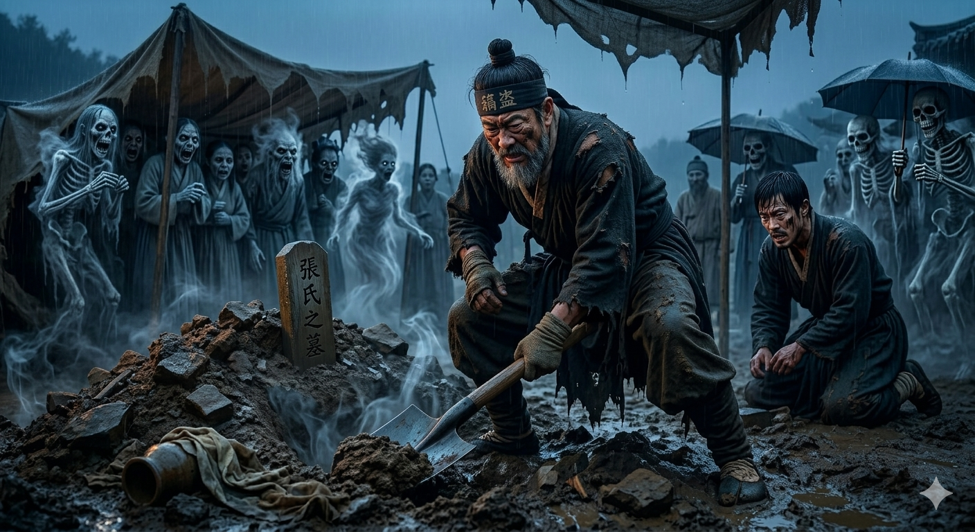 산 아래 사람들 사이에 소문이 돌았다. 산에 귀신이 산다고. 무덤을 파는 귀신이라고. 가끔 나무꾼들이 새벽에 산비탈을 지나다 보면, 안개 속에서 삽질 소리가 들리고, 이마에 글자가 새겨진 노인이 흙을 다독이고 있다고.