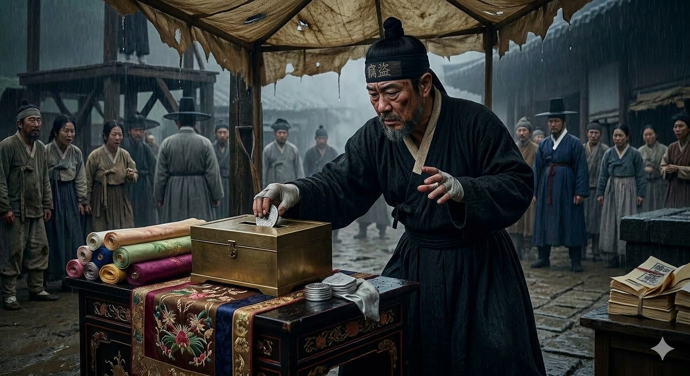구경꾼들이 모여들었다. 저잣거리에서, 골목에서, 멀리 다른 마을에서까지. 장의사 두천이 세도가 집을 털고 죽은 자의 품을 뒤졌다는 소문은 고을 전체를 뒤흔들었다. 사람들은 속았다는 분노와 믿고 싶지 않다는 당혹감 사이 어딘가에서 술렁였다.