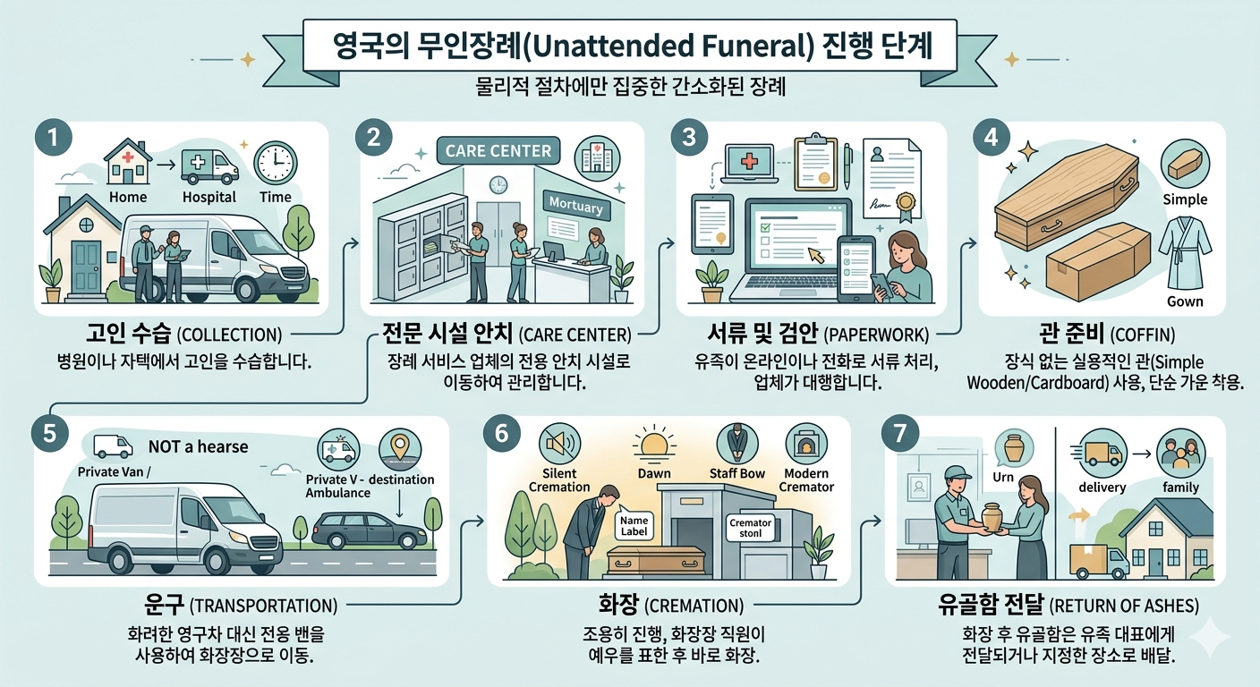 영국의 무인장례(Unattended Funeral)는 장례식장을 완전히 건너뜁니다. 하지만 고인의 유체를 관리하고 화장장으로 운송하는 ‘전문 서비스’는 여전히 장례 지도사(Funeral Director)가 수행합니다. 구체적으로 어떻게 진행되는지 단계별로 정리해 드립니다.