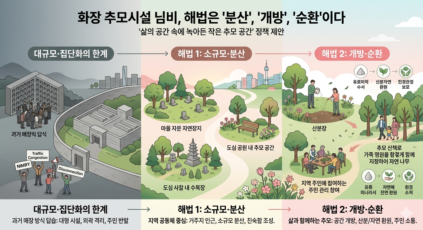 대규모화하고 집단화할수록 화장 추모시설에 대한 거부감은 더 커진다. 역설적으로, 일상 공간에 작은 추모 공간이 자연스럽게 녹아들수록 우리는 죽음을 더 성숙하게 바라보게 된다. 장사정책은 이제 매장 시대의 논리에서 벗어나야 한다. 분산하고, 개방하고, 순환시키며 주민과 함께 만들어야 한다. 지금 정책은 반대 방향으로 달리고 있다.