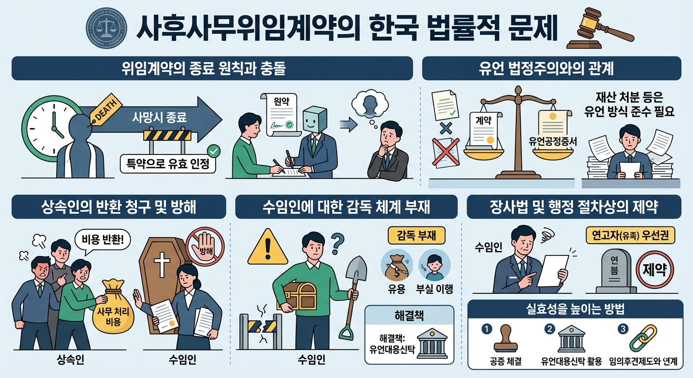 문제점: 수임인이 고인의 재산을 유용하거나, 장례를 제대로 치르지 않아도 이를 사후에 제재하거나 강제하기가 어렵습니다.