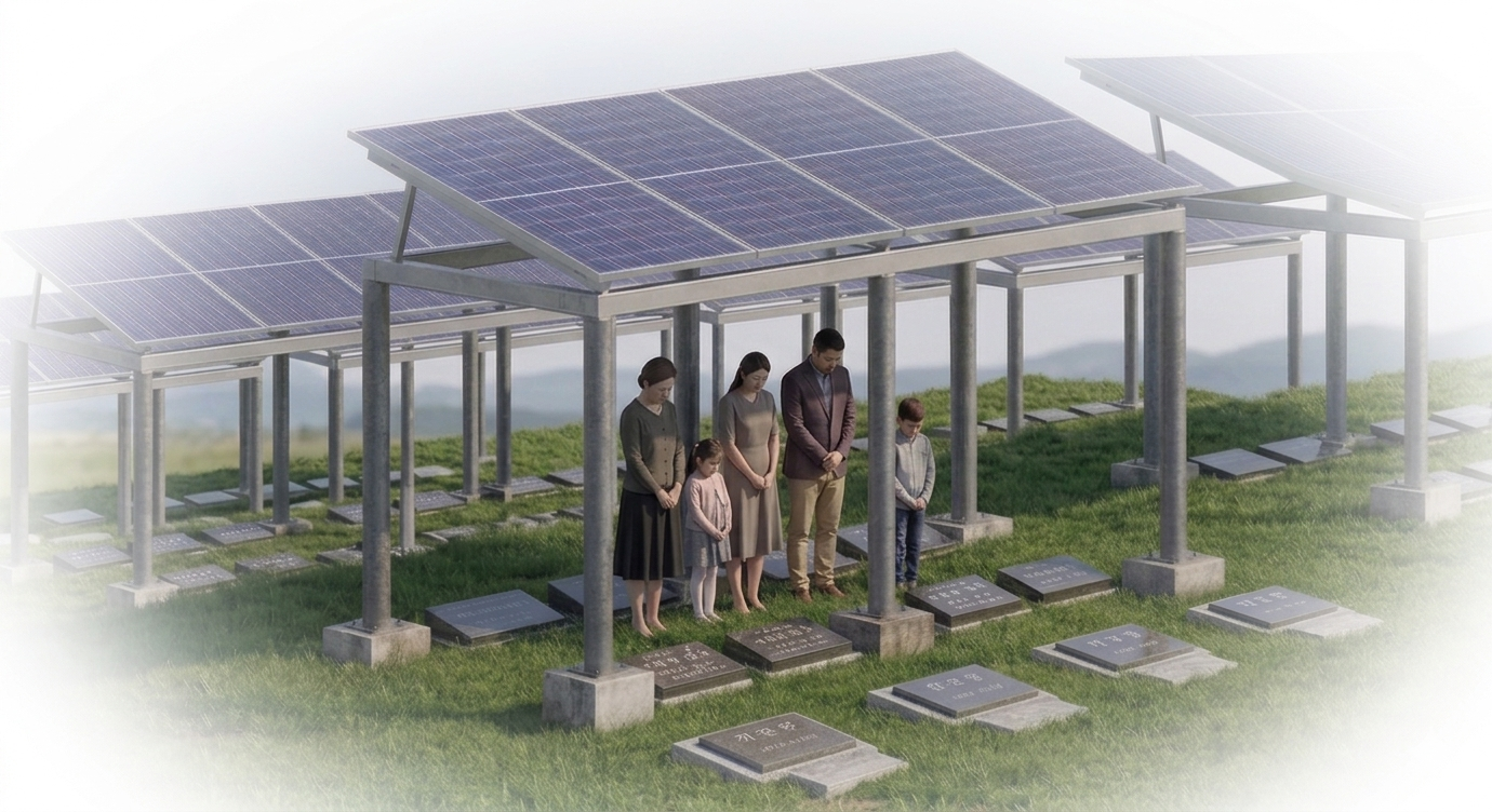 공설 묘지 및 자연장지에 캐노피형 태양광 패널을 설치하는 구성. 지상고 2.5m 이상 기둥 구조물로 묘지 지면과 패널을 분리하는 방식. 발전 수익의 25% 이상을 에너지 취약 가구에 우선 배분하는 수익 배분 모델. 캐노피 경사면을 이용한 빗물 집수를 묘지 관개·청소용수로 병행 활용하는 통합 시스템. 무연고 묘지 구역을 기초 설치에 우선 활용하는 방안.