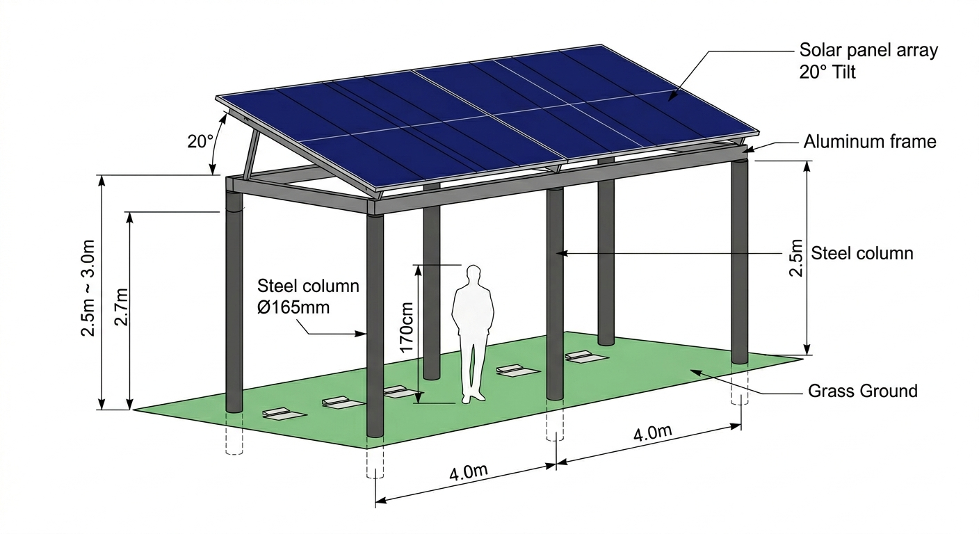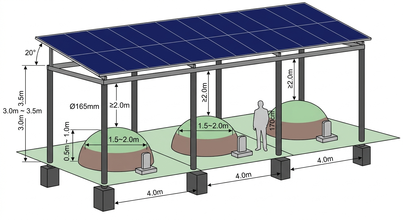 봉분형 공설묘지에는 기둥식 캐노피로 설치한다(Type B). 기둥을 묘지 열 구획 경계선에 배치해 봉분을 건드리지 않는다. 봉분 높이(최대 1.0m)를 고려해 지상고를 3.0~3.5m로 높인다. 방치된 무연고 구역은 기초 콘크리트 타설 우선 공간으로 활용한다. 관리 공백이 에너지 인프라로 전환된다.