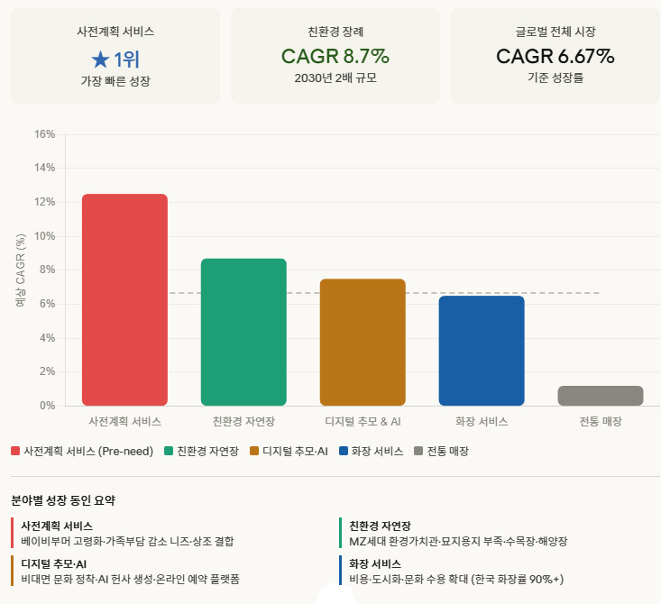 사전 장례 계획 서비스는 현재 가장 빠르게 성장하는 세그먼트로, 가족 부담 경감과 미래 비용 관리에 대한 소비자 수요에 힘입어 확대되고 있다. 구체적으로 세 가지 이유에서 이 분야가 선두라고 판단한다.