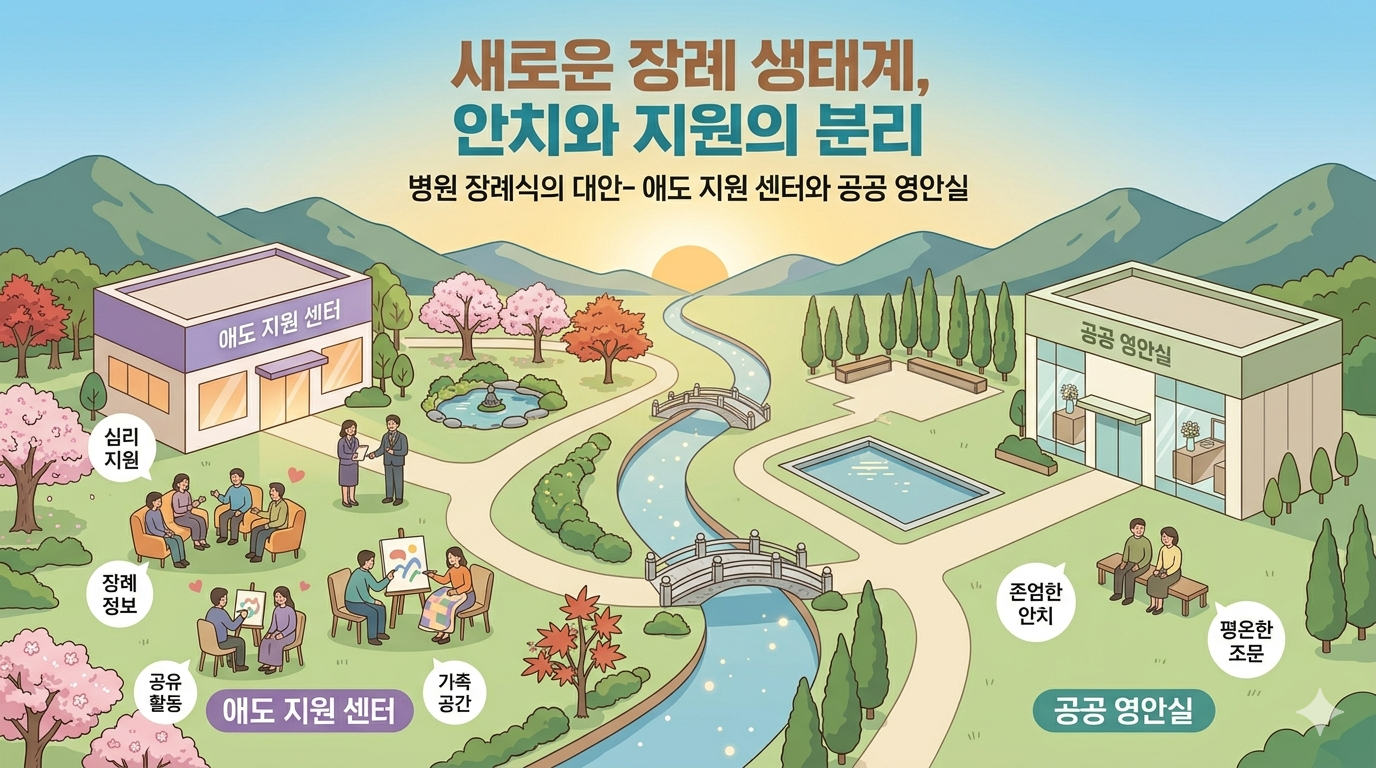 장례식장이 단순히 '죽음의 처리'라는 실무에 매몰되어 있다면, 애도 지원 센터는 '사별의 경험'을 보듬고 '삶의 회복'을 돕는 데 집중합니다. 이제 우리 사회도 병원 장례식장의 편리함 이면에 가려진 독점과 소외의 구조를 직시해야 할 때입니다.