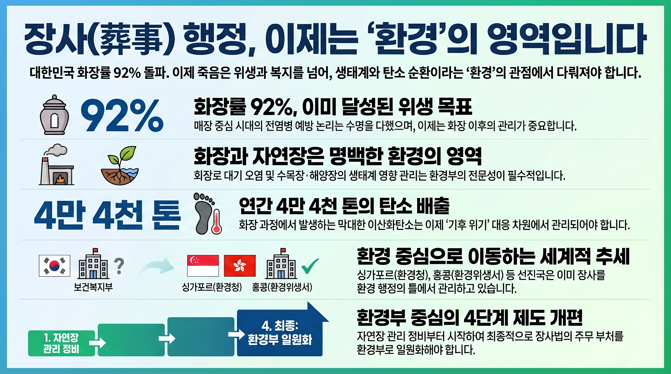 넷째, 이 모든 흐름이 쌓이면 「장사 등에 관한 법률」의 주무부처를 환경부로 명시하는 전면 개정이 자연스럽게 뒤따를 것이다.