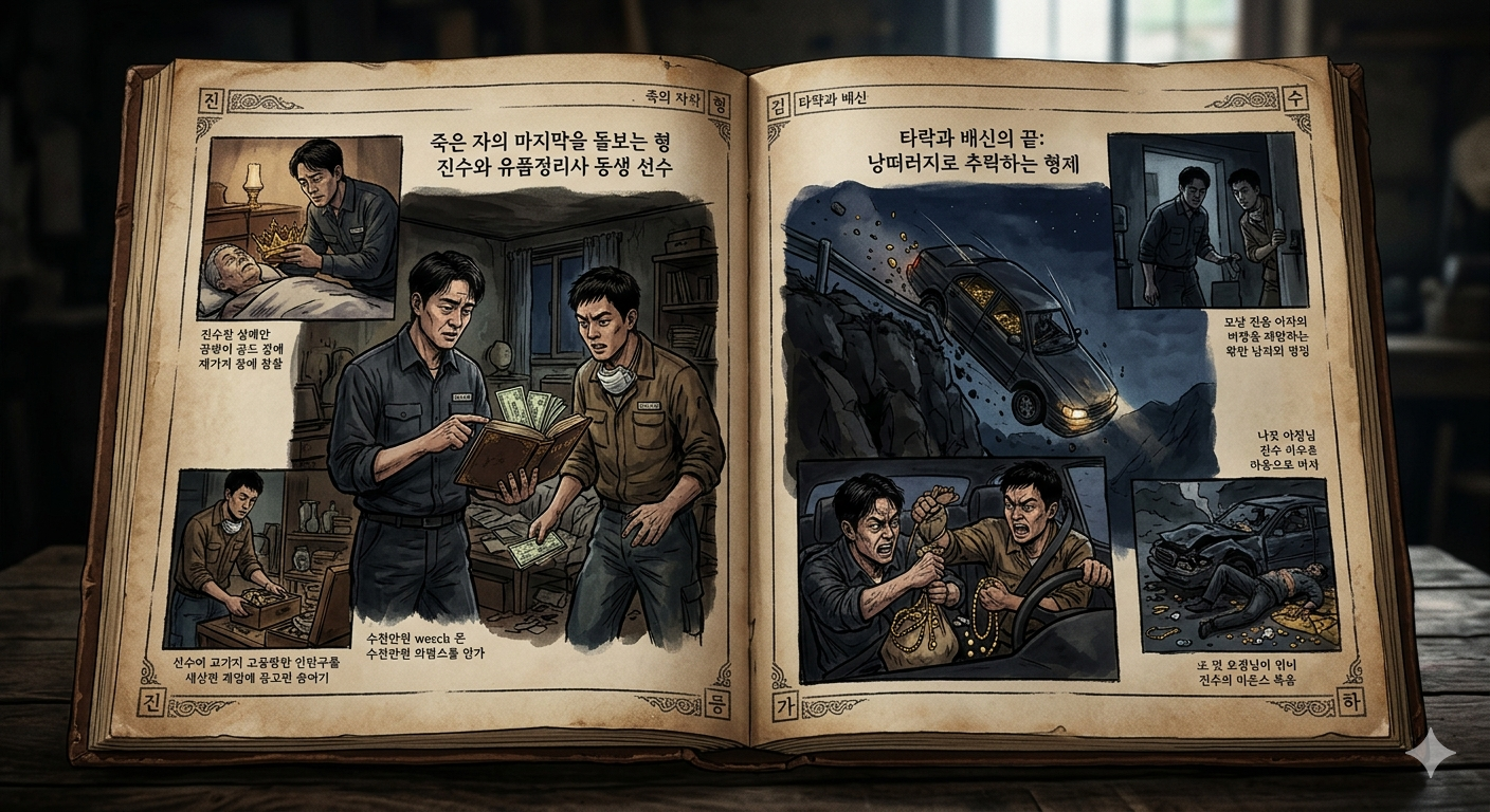 선수는 유품을 정리하며 귀중품을 따로 챙겨 암시장에 내다 팔았다. 고독사한 노인의 서랍에서, 무연고 사망자의 선반에서. 그는 그것을 '죽은 자가 주는 선물'이라고 불렀다. 처음에는 농담처럼 말했다. 그러다 어느 순간부터 농담이 아니게 되었다.