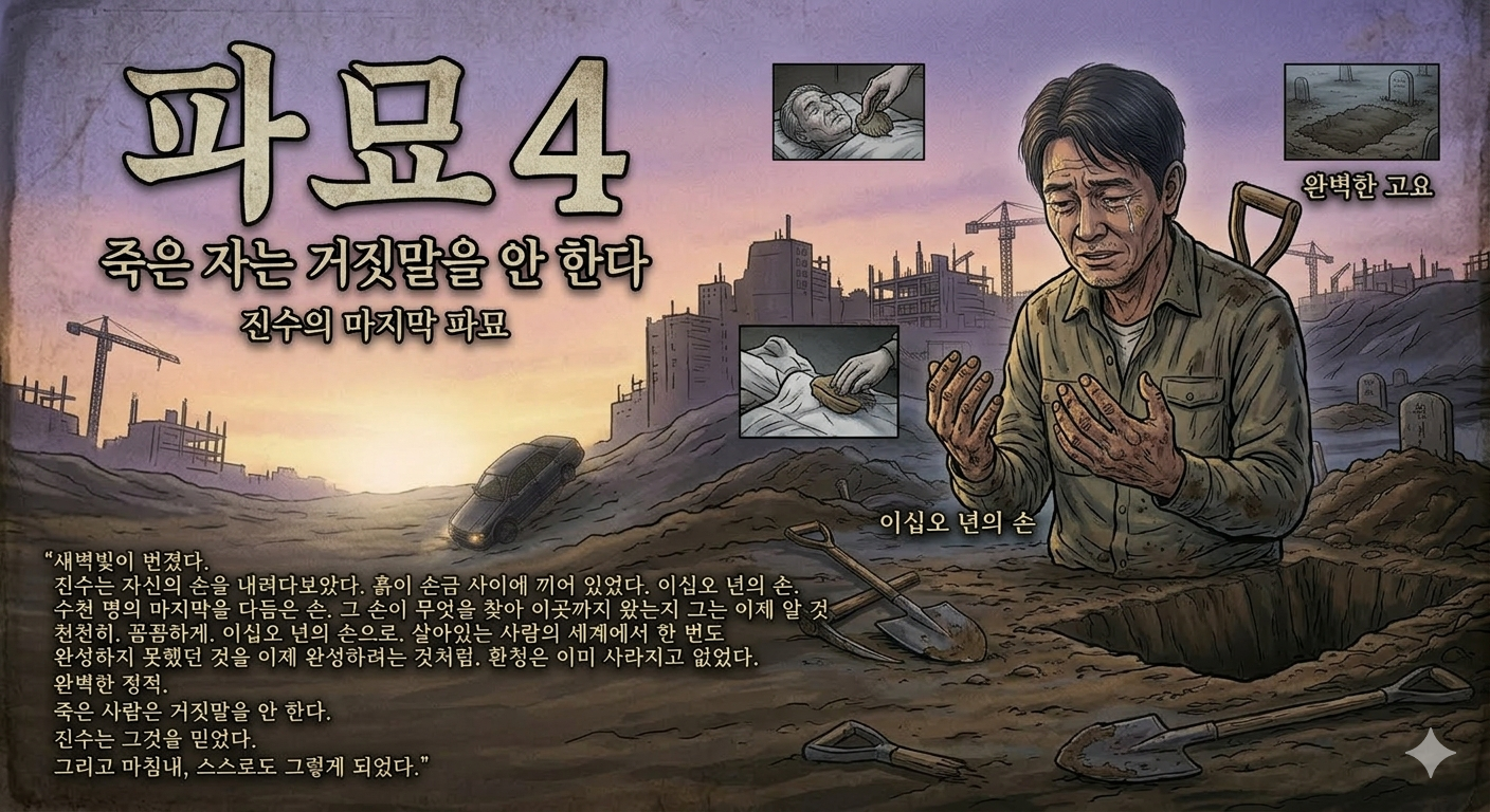 처음이었다. 그 목소리들이 이렇게 완전히 멈춘 것은. 진수는 손을 관 위에 얹은 채로 오래 있었다. 새벽빛이 조금씩 번졌다. 그는 천천히 흙을 다시 덮었다. 봉분을 원래대로 다듬었다. 숙련자의 손으로, 꼼꼼하게.