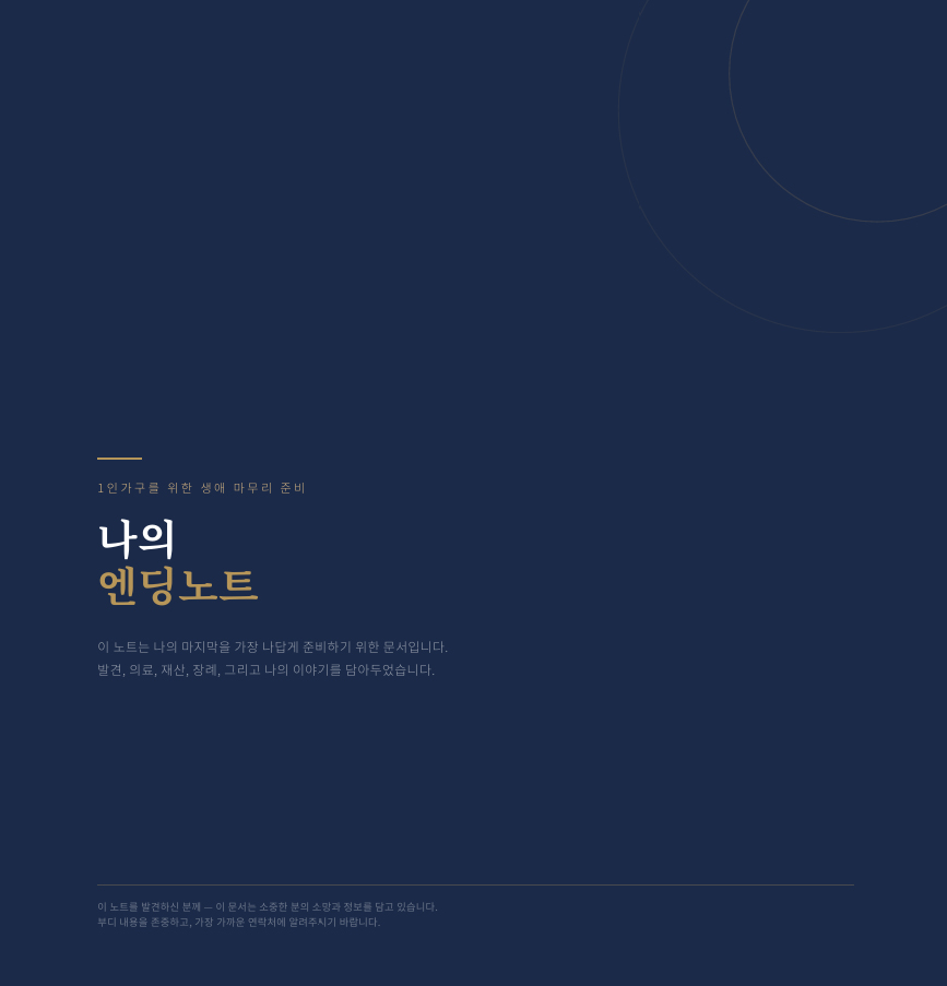 엔딩노트는 '죽음을 준비하는 노트'가 아니라 '나 없이도 내 삶이 존엄하게 마무리될 수 있도록 설계하는 문서' 입니다. 1인가구에게는 이것이 선택이 아닌 필수입니다. 가족이 자연스럽게 담당하던 역할들 — 발견, 의료 결정, 재산 정리, 장례, 유품 처리 — 을 1인가구는 스스로 문서화해야 하기 때문입니다. 빠를수록 좋고, 작성 후에도 생활 변화에 따라 주기적으로 업데이트하는 것이 핵심입니다.